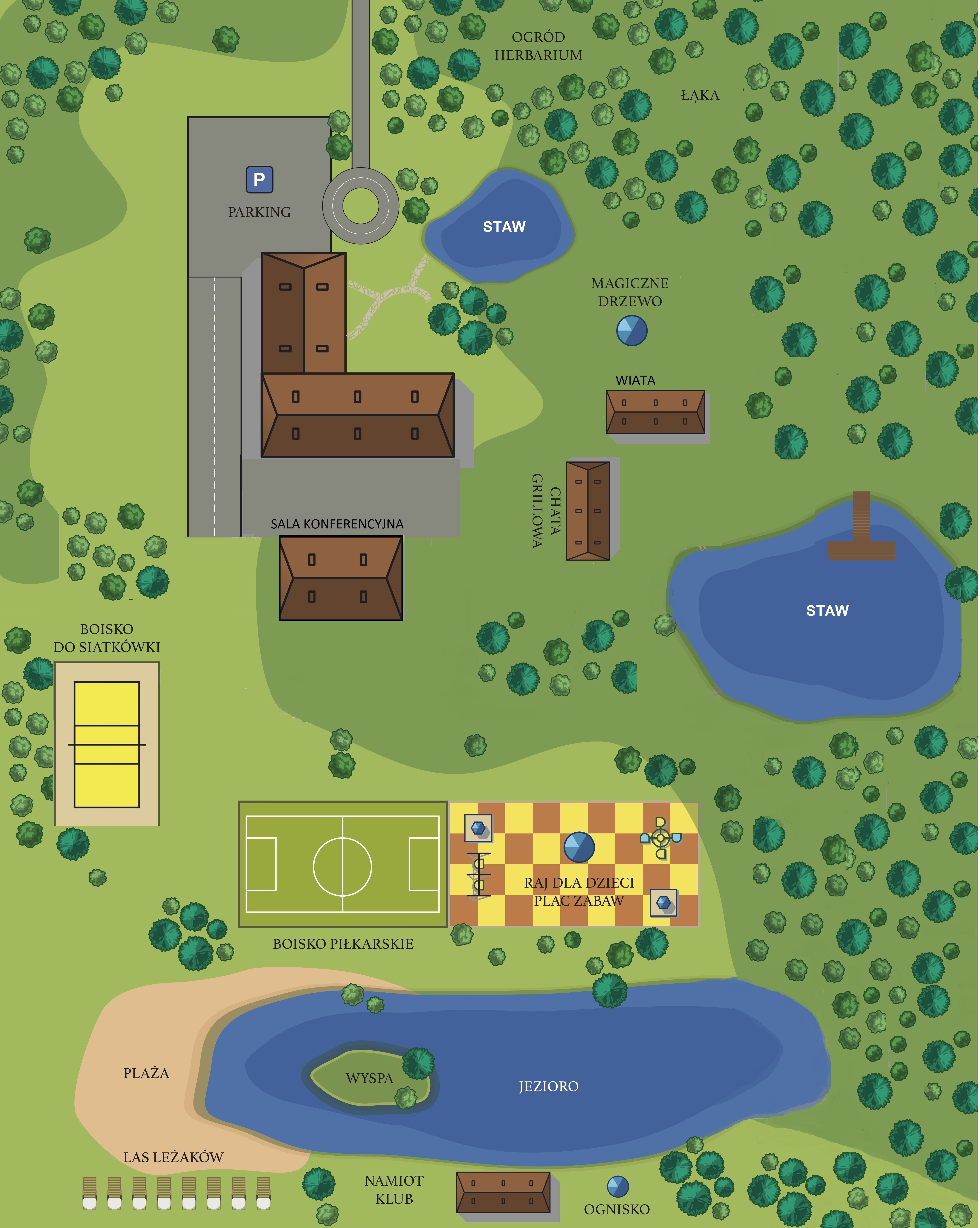 Dysponujemy rozległym, trzyhektarowym terenem położonym w otoczeniu lasów i bezpośrednio nad jeziorem. To przestrzeń stworzona z myślą o organizacji dużych wydarzeń plenerowych – firmowych, integracyjnych, sportowych czy rodzinnych – nawet do 400 Gości.